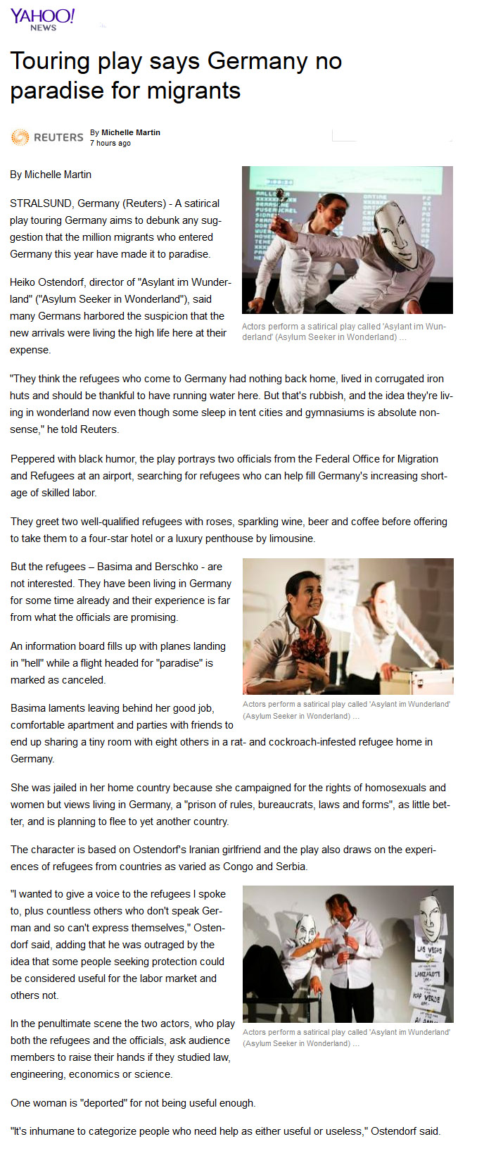 "Die beiden Schauspieler Johanna Kollet und Jörg Schulze-Neuhoff bestechen mit Wandlungsreichtum und sprachlicher Intensität, agieren zwischen optimistischen Durchhalteparolen, ironischem Galgenhumor und brutaler Selbstaufgabe. In einer grotesken Mischung aus seelenlosem Robinson-Club-Animateur und aufdringlichem Fußgängerzonen-Abo-Werber tragen Kollet und Schulze-Neuhoff als Begrüßungsbeamte schlecht sitzende Lächelmasken. Als Flüchtlinge agieren sie schutzlos voller Gefühle und sind dem Masken-"Paradies" ausgeliefert, das sich als "Endstation Hölle" entpuppt... Autor und Regisseur Heiko Ostendorf mischt gekonnt wahre Begebenheiten, wie den Suizid des Asylbewerbers Mohammad Rahsepar, mit fiktiven Nachrichten... Heiko Ostendorf ist ein mutiges Stück gelungen, das intelligent die Balance hält zwischen überspitzter Gesellschaftskritik, politischer Utopie und alltäglichen Flüchtlingsschicksalen." Westfälische Nachrichten (Den kompletten Artikel finden Sie hier.) "Da lauern etwa in einer satirischen überspitzten Szene zwei Beamte am Flughafen möglichen Flüchtlingen auf. Sie wollen sie mit Rosen und der Aussicht auf ein Penthouse willkommen heißen. Ist das theatrale Utopie eines schönen, neuen Deutschlands? Keineswegs. Denn den Beamten geht es keineswegs um Menschlichkeit, sondern um Wirtschaftlichkeit. Sie sind auf der Suche nach neuen Fachlräften für das Land. Willkommen sind nur diejenigen, die gebraucht werden... Mühelos meistern Johanna Kollet und ihr Schauspielkollege Jörg Schulze-Neuhoff das Hin und Her zwischen satirischen Witzfiguren und realistischen Monologen, in denen das Stück nah an die Situation von Flüchtlingen ranzoomt." Neue Osnbrücker Zeitung (Den kompletten Artikel finden Sie hier.) "Ein eindrucksvolles, nachdenklich stimmendes Stück." Stendaler Volksstimme (Den kompletten Artikel finden Sie hier.) "Theater darf phantasieren. Es darf zwei Servicebeamte an einem Flughafen mit Rosen auf Asylbewerber zugehen lassen. So beim theater odos in der Haller Hospitalkirche. Viele Zuschauer gingen bewegt heim." Haller Tagblatt (Den kompletten Artikel finden Sie hier.) "Touring play says Germany no paradise for migrants" Reuters (Yahoo-News) (Den kompletten Artikel finden Sie hier.) "Satirisches Stück 'Asylant im Wunderland' kritisiert Umgang mit Flüchtlingen" Cellesche Zeitung (Den kompletten Artikel finden Sie hier.) "Böser Blick aufs Land" Elbe-Jeetzel-Zeitung (Den kompletten Artikel finden Sie hier.) |